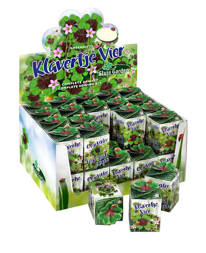 Showdoos/Display greengifts, gevuld met 40 greengift doosjes Klavertje vier. Elk doosje bevat een plastic potje, jiffy-schijfje (gedroogde aarde) en twee klavertje vier bolletjes.
